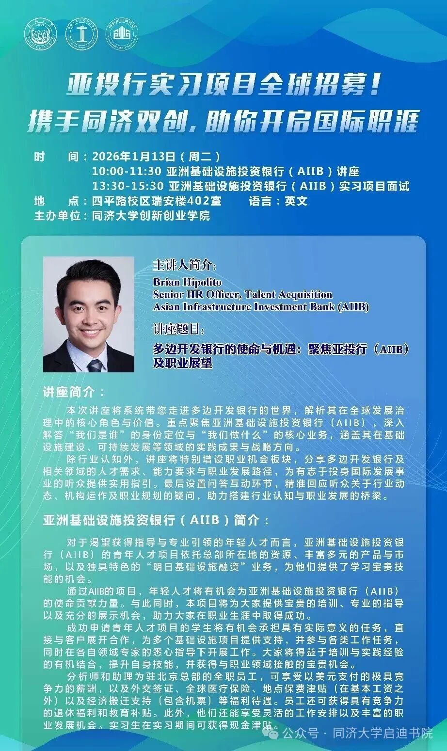 亚投行实习项目全球招募! 携手同济双创,助你开启国际职涯